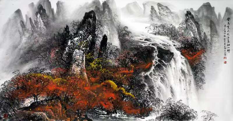 杜中良先生的山水画,是情与景的完美交融,是形与意的深刻对话。每一幅作品都蕴含着他对大自然的敬畏之情和对生命哲理的深刻思考。他的笔墨间既有北派山水的雄浑壮阔,又不失南派山水的细腻温婉,既保留了传统山水画的古朴韵味,又融入了现代审美视角的创新元素。色彩层次丰富,笔墨苍劲有力,每一笔、每一划都透露出他对自然美的独到见解和深厚情感。