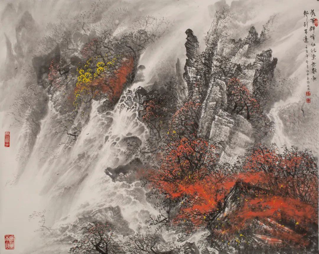 落笔群峰红似染,无数秋声到耳边